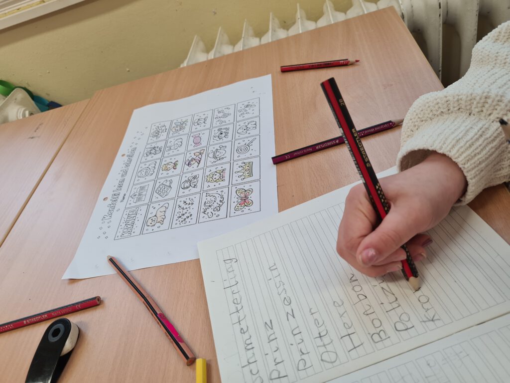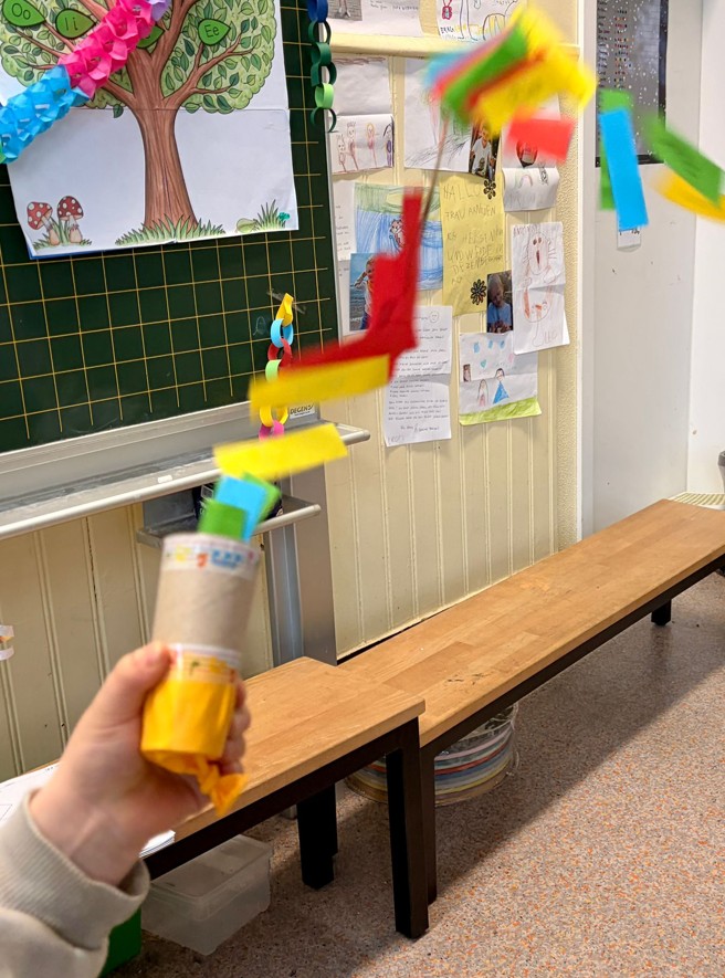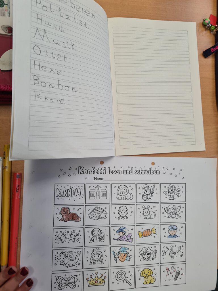Die Otterklasse 1b ist immer noch im Karnevalsfieber. Mit einer Konfettikanone wurden heute kunterbunte Wörter zum Thema Karneval in die Luft geschossen. Jedes Kind nahm sich ein Wort und schrieb es ins Heft. Das Wort wurde gelesen und das passende Bild dazu ausgemalt. Dann ging es wieder von vorne los. Das hat Spaß gemacht!